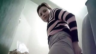 Adorable young shy girl actually sees hidden webcam in the toilet