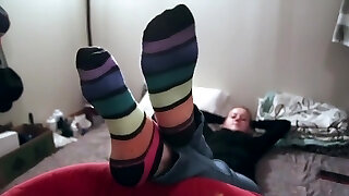 Torrid giggling brunette in socks gives my pal a indeed great footjob