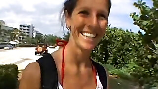 Uber-cute and busty brunette jerks off a man she met at the beach until he gushes