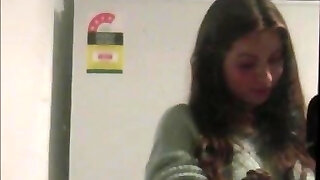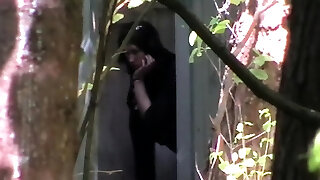 Super-cute amateur lady in blue jeans filmed in the public toilet