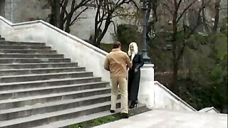 Blonde long-haired babe rubs her clit and pees on the stairs