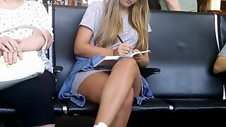 Amazing Platinum-blonde in Bus (downblouse and upskirt no pantie)